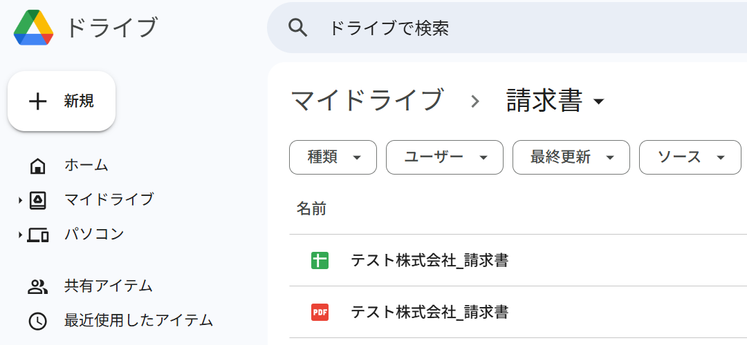 また、先ほど指定したGoogle Driveのフォルダに書類が格納されました。