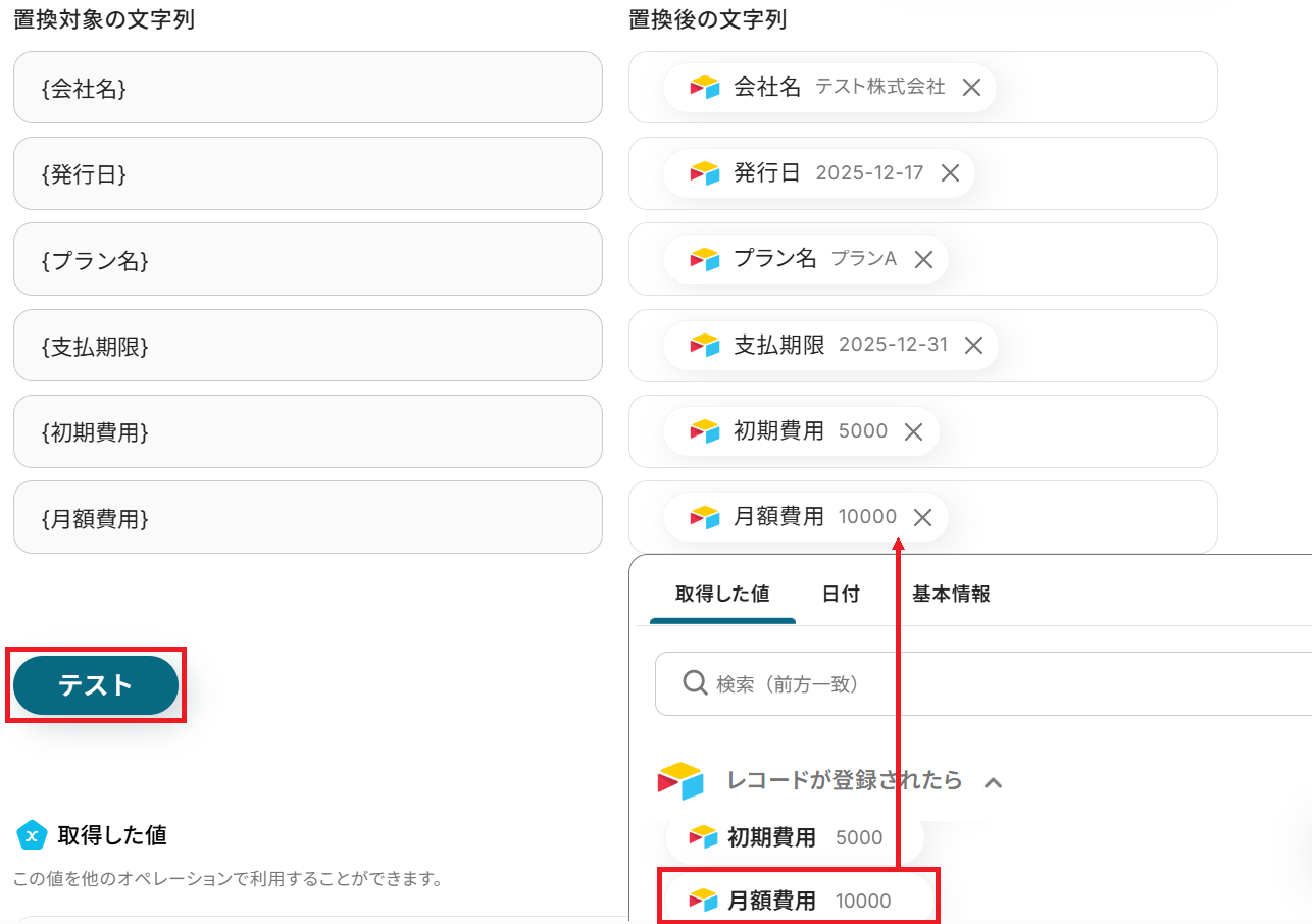 トリガーやオペレーション設定時に「テスト」を実行して取得した値のことです。