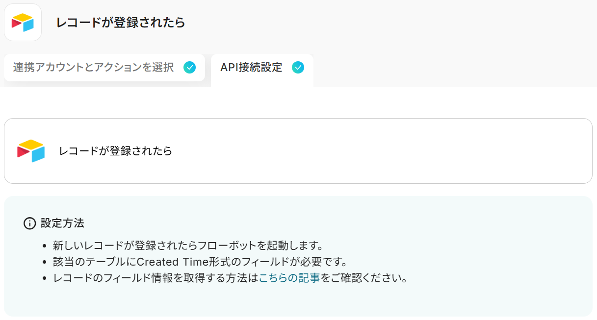 タイトルと連携するアカウント情報を任意で設定し、アクションはテンプレート通りに「レコードが登録されたら」のまま「次へ」をクリック。