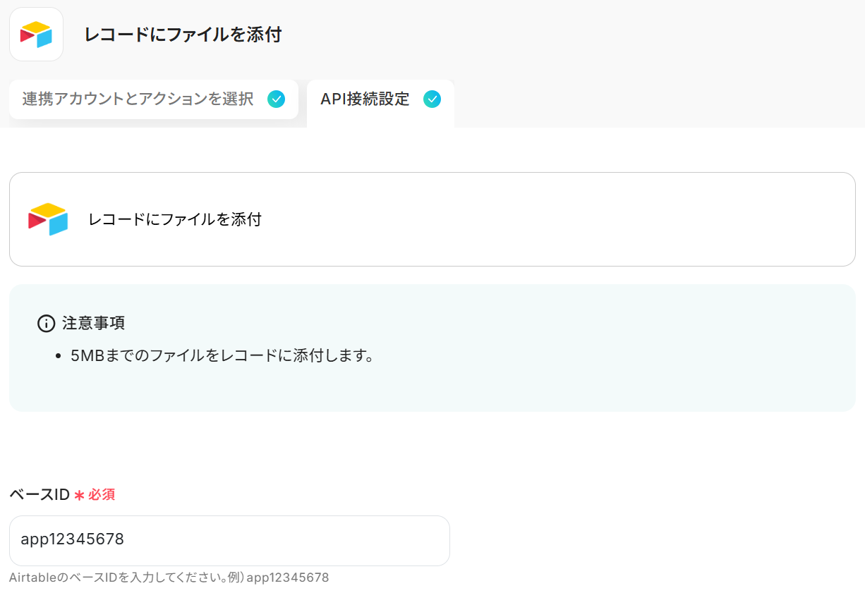 - Airtableでレコードを取得するアクションでは、対象となるベースIDやテーブルIDを任意のものに設定してください。