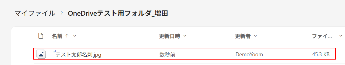 次に、OneDriveの画面に移動し、先ほどフォルダIDに設定したフォルダ内に名刺など情報を読み取りたいファイルをアップロードしましょう。 今回ご紹介するテンプレートは、OneDriveの特定フォルダ内にファイルが作成または更新されたら起動します。 そのため、実際にテストを行うには、先ほどフォルダIDに設定したフォルダ内にファイルをアップロードする必要があります。 今回は以下のファイルをアップロードしました。