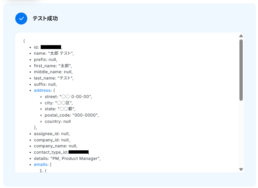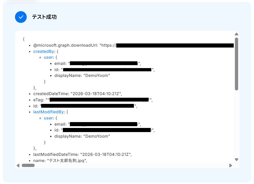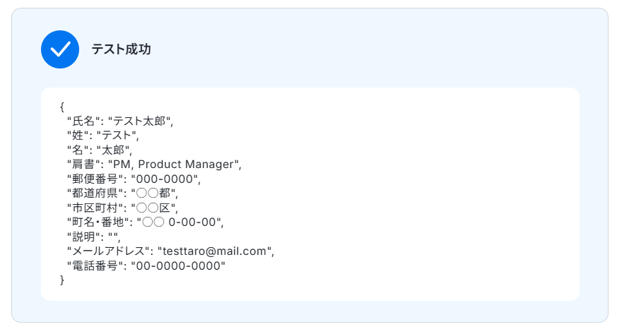 テストに成功するとテスト成功画面が表示され、取得した値が表示されます。 取得した値は実行した結果が設定される動的な値として利用できるため、このあとの設定でも使用します。 詳しく知りたい方は以下のリンク先をご覧ください。
