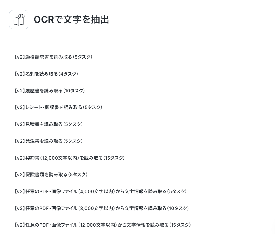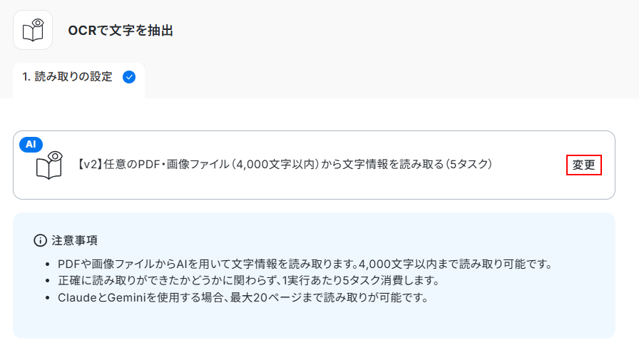 今回はデフォルトで設定されている【v2】任意のPDF・画像ファイル(4,000文字以内)から文字情報を読み取る(5タスク) を使用します。 なお、変更 をクリックすることで別のものに変えることも可能です。