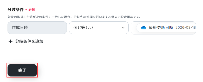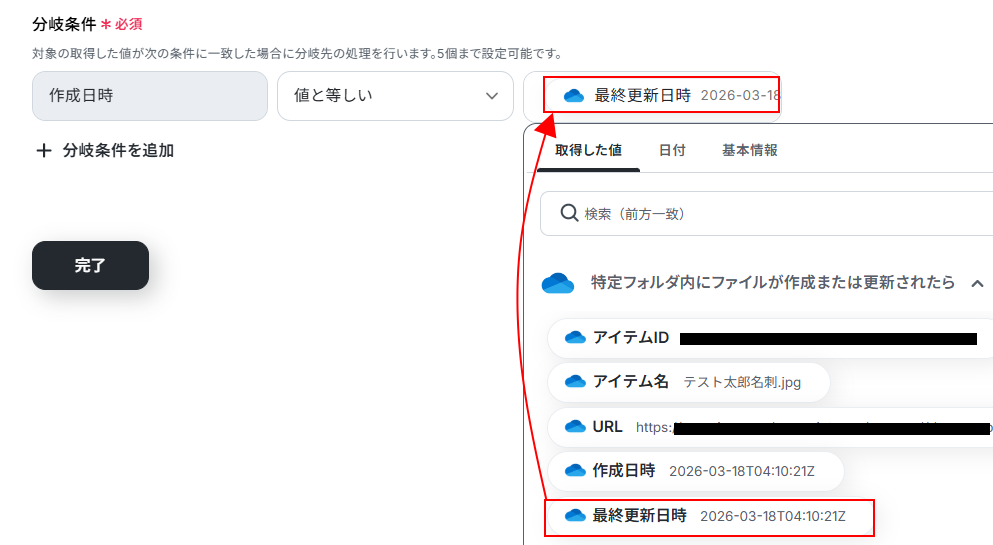 分岐では、取得した値を利用してこのあとの処理を分けることができます。 分岐条件を指定の項目で分岐に利用する取得した値の設定を行っています。 デフォルトで特定フォルダ内にファイルが作成または更新されたら のアクションで取得した、作成日時 が設定されていますのでご確認ください。