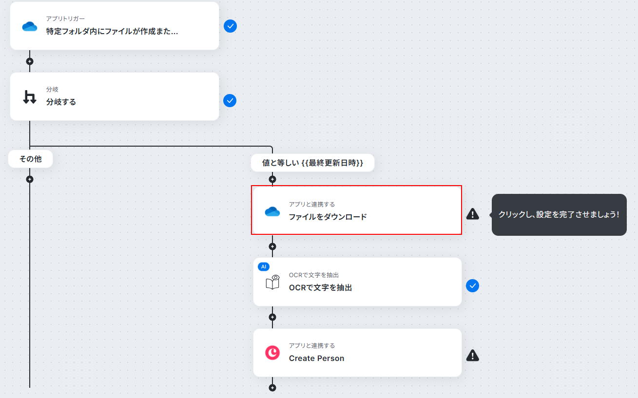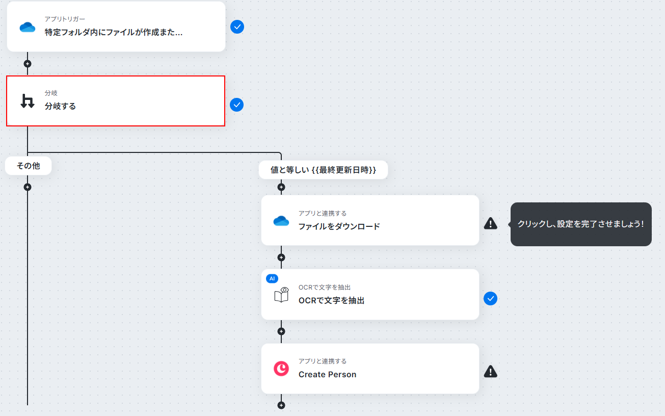 ステップ4:分岐設定 このステップでは、取得したファイルが新規作成されたものか、更新されたものかを判断します。