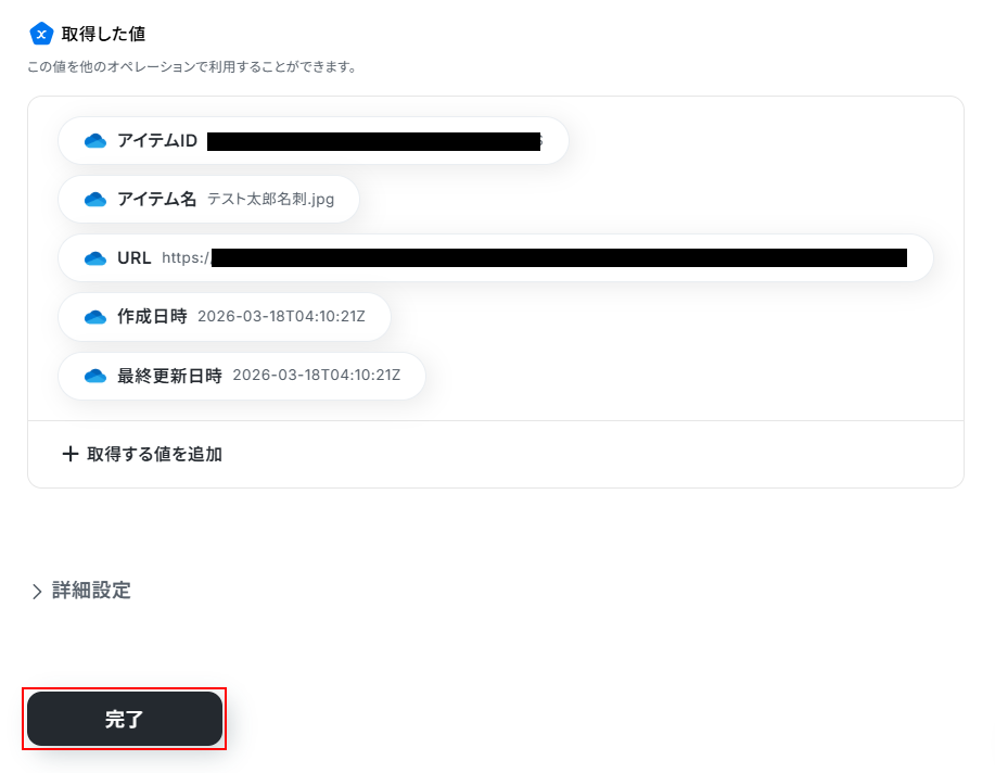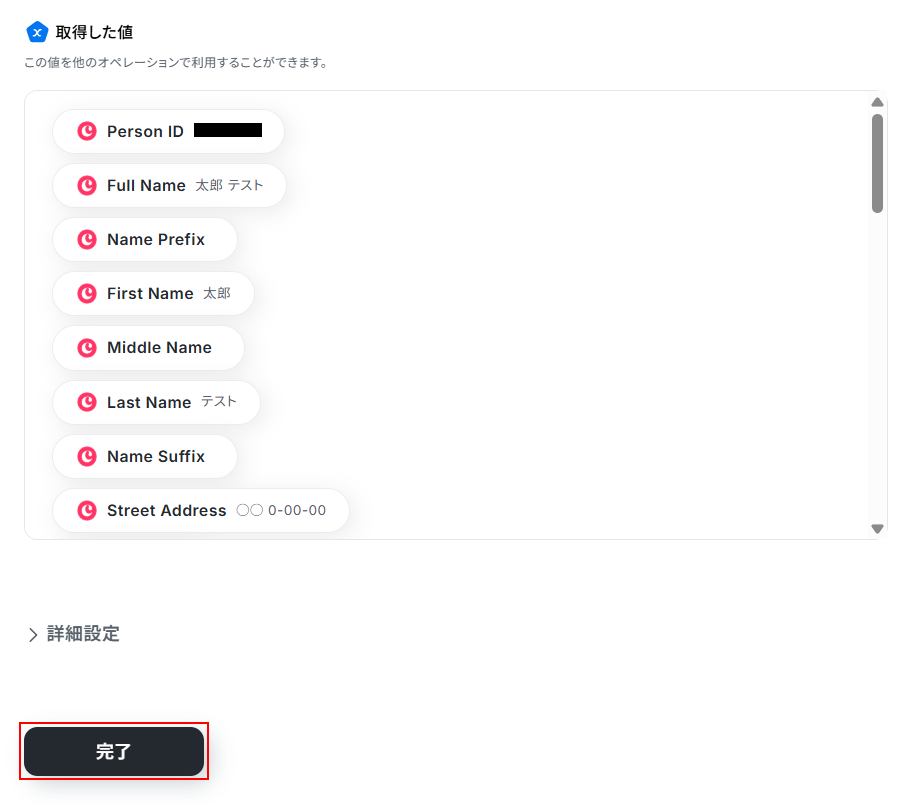 テストに成功するとテスト成功画面と取得した値が表示されますのでご確認ください。 確認できたら完了 をクリックしましょう。