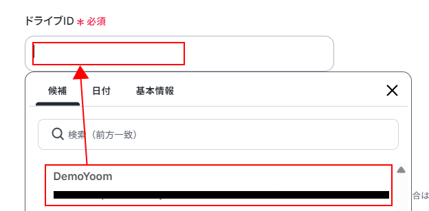 ドライブIDを設定します。 入力欄をクリックし、表示された候補の中から使用したいものを選択してください。