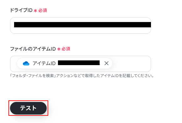 ファイルのアイテムIDにはデフォルトで取得した値が設定されています。 項目名だけではなく、実際の値が表示されているのを確認してください。