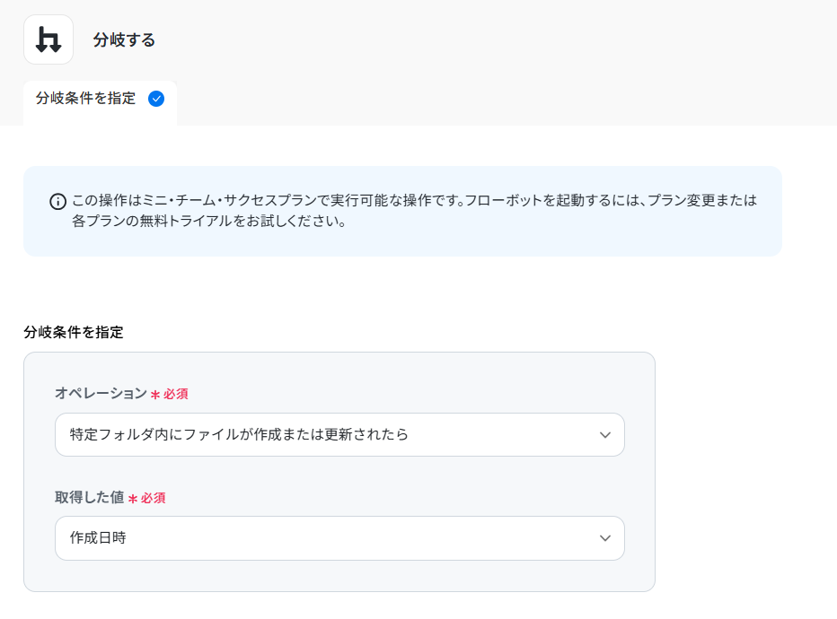 ※「分岐する」オペレーションは、ミニプラン以上でご利用いただけます。フリープランで利用するとエラーになってしまうのでご注意ください。