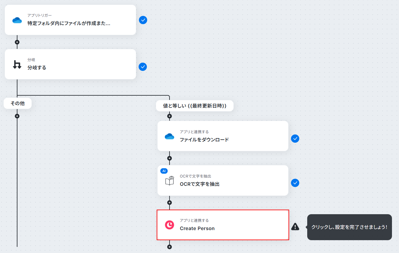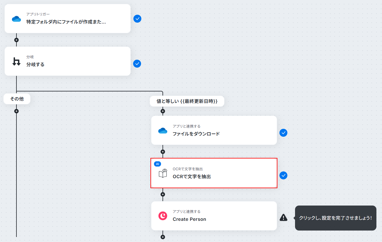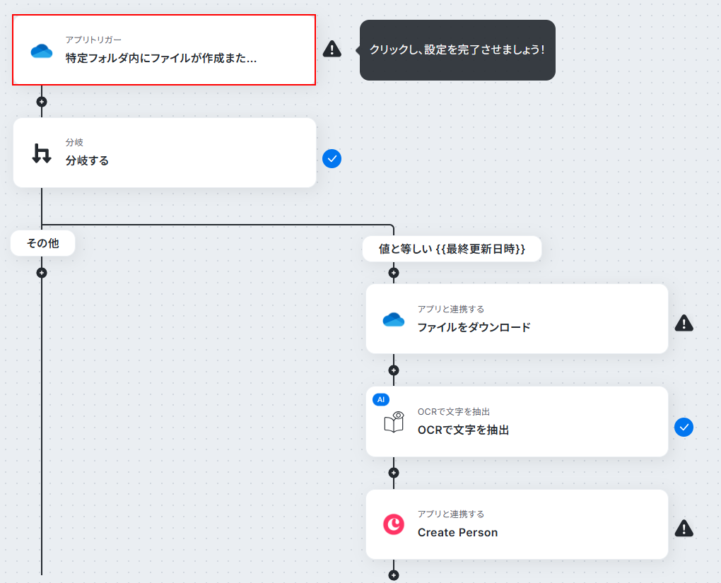 OneDriveのトリガー設定および分岐、OneDrive、OCR、Copperのアクション設定