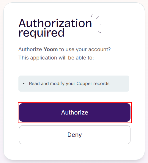 表示内容を確認し、問題なければAuthorize をクリックしましょう。 ※Copperにログインしている状態だと以下の画面が表示されます。 ログインしていない場合はログイン画面が表示されますのでログインしてください。