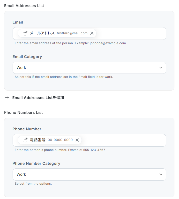EmailやPhone Numberにも同様に取得した値を設定します。 また、各CategoryにはそれぞれデフォルトでWorkが選択されています。 利用したいものに変更してください。