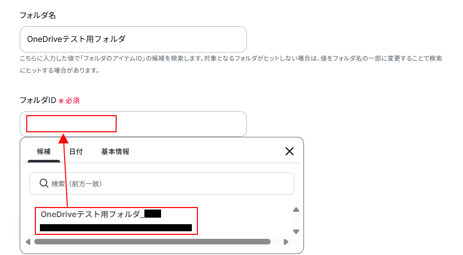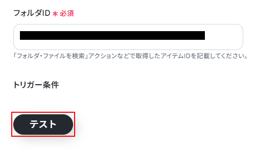 フォルダIDを設定します。 入力欄をクリックすると、フォルダ名の項目に設定したフォルダが表示されますので選択してください。