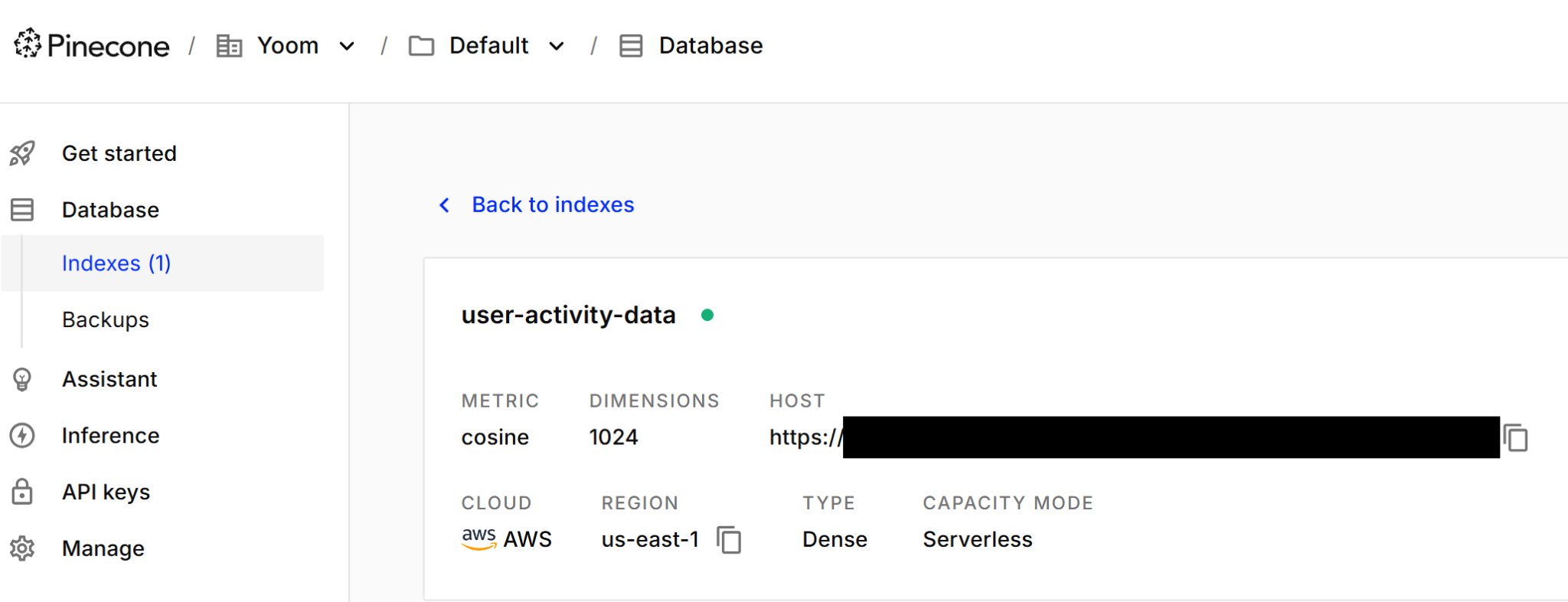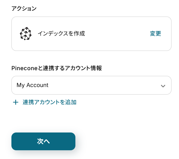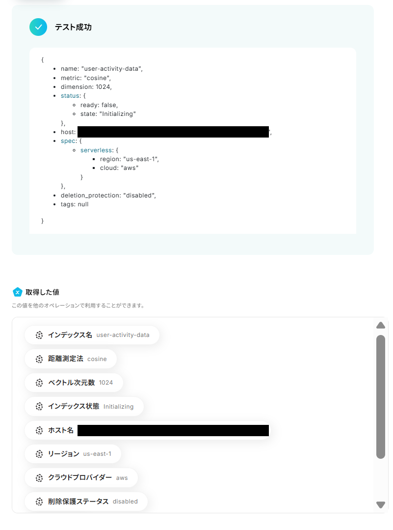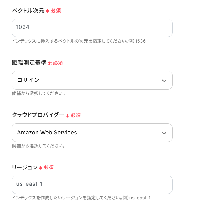ここでは前項で取得した値からPineconeにインデックスを作成する設定を行います。