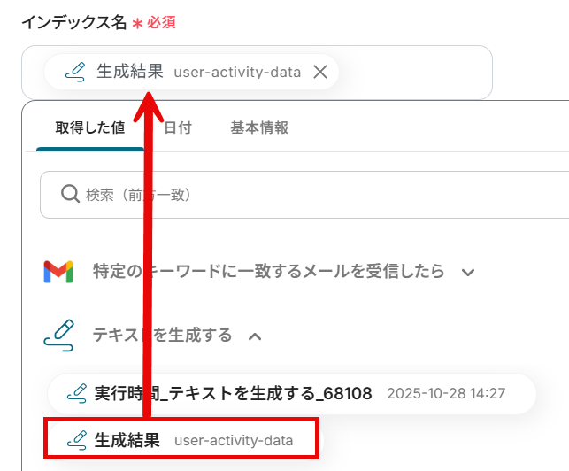 インデックス名には、前項で取得した値から「生成結果」を選択しましょう。
