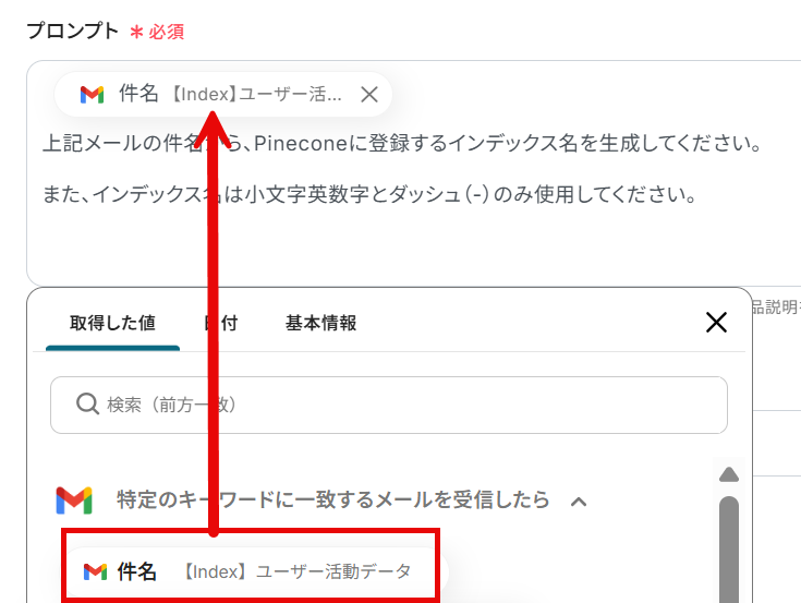 プロンプトに、前項で取得した値から「件名」と指示文を入力します。