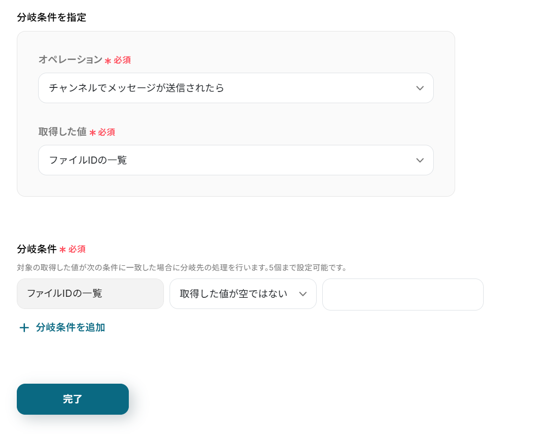 - 次に、オペレーションで分岐機能を設定し、メッセージにファイルが添付されている場合のみ後続の処理に進むようにします