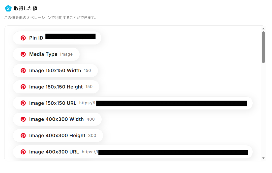 - 最後に、オペレーションでPinterestの「Create Pin」アクションを設定し、ダウンロードしたファイルをもとにピンを作成します