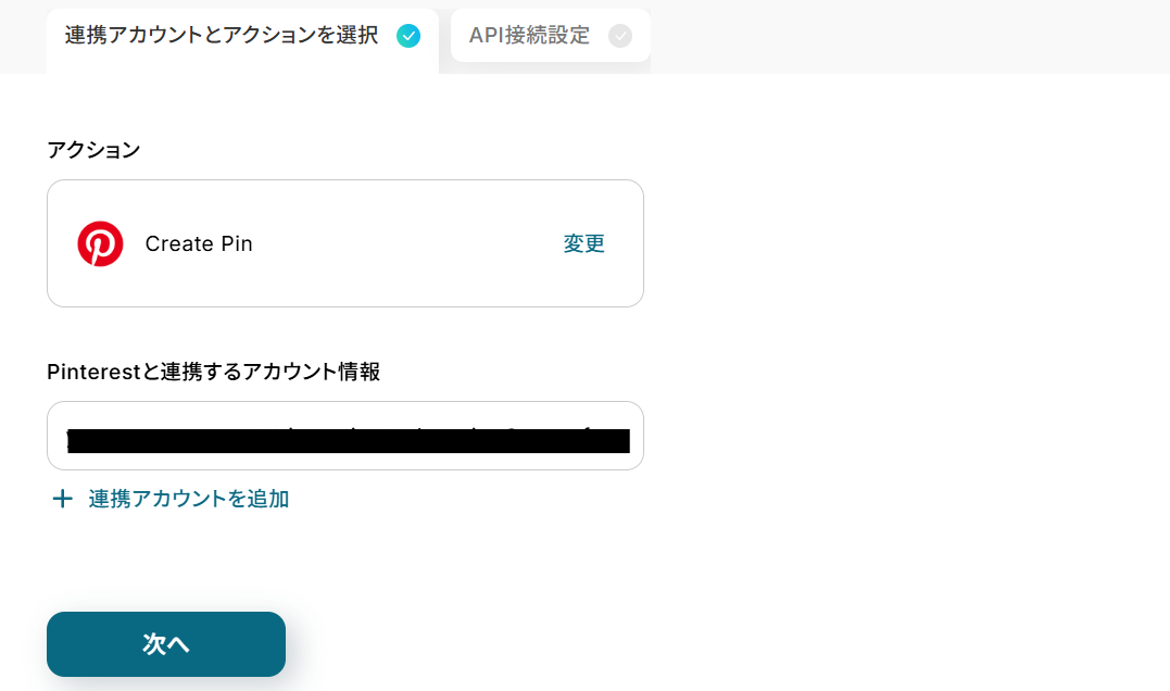 - Pinterestの「Create Pin」アクションでは、ピンを追加したいボードのIDや、コンテンツの種類(Content Type)を任意で設定してください