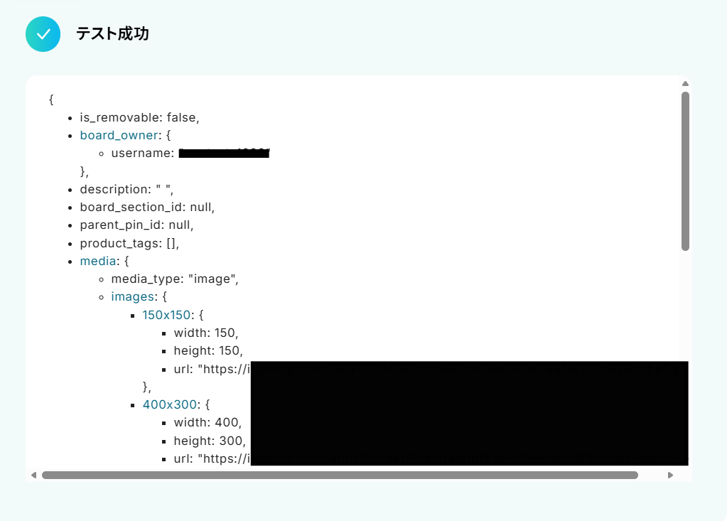 - Pinterestでピンを作成するアクションでは、投稿先のボードIDとコンテンツタイプを任意で設定してください