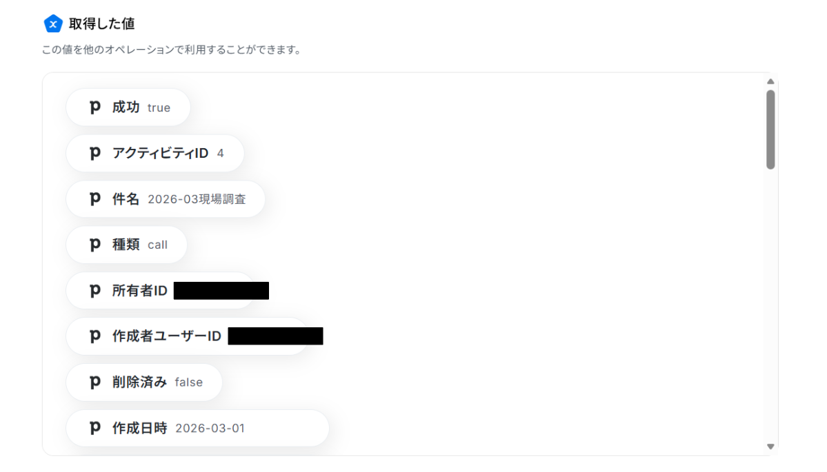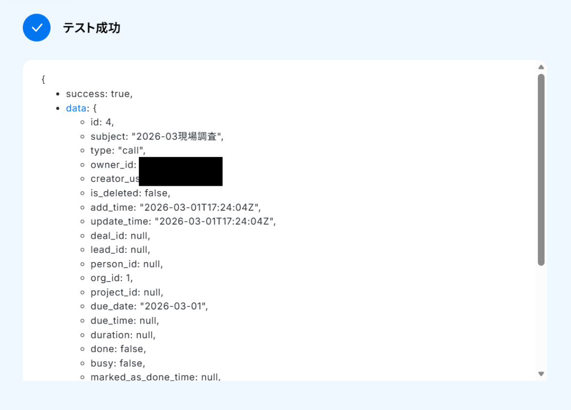 テストに成功すると「取得した値」にPipedriveの情報が反映されます。