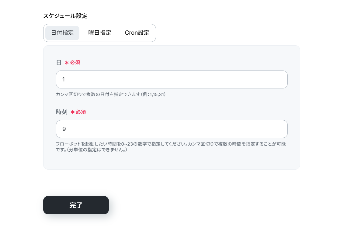 スケジュール設定は日付指定、曜日指定、Cron設定など、自由に起動タイミングを選択できます。