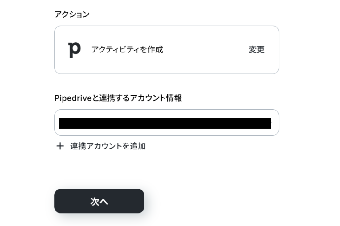 (2)Pipedriveと連携するアカウント情報に誤りがないかを確認し、アクションは「アクティビティを作成」のままで「次へ」をクリックします。