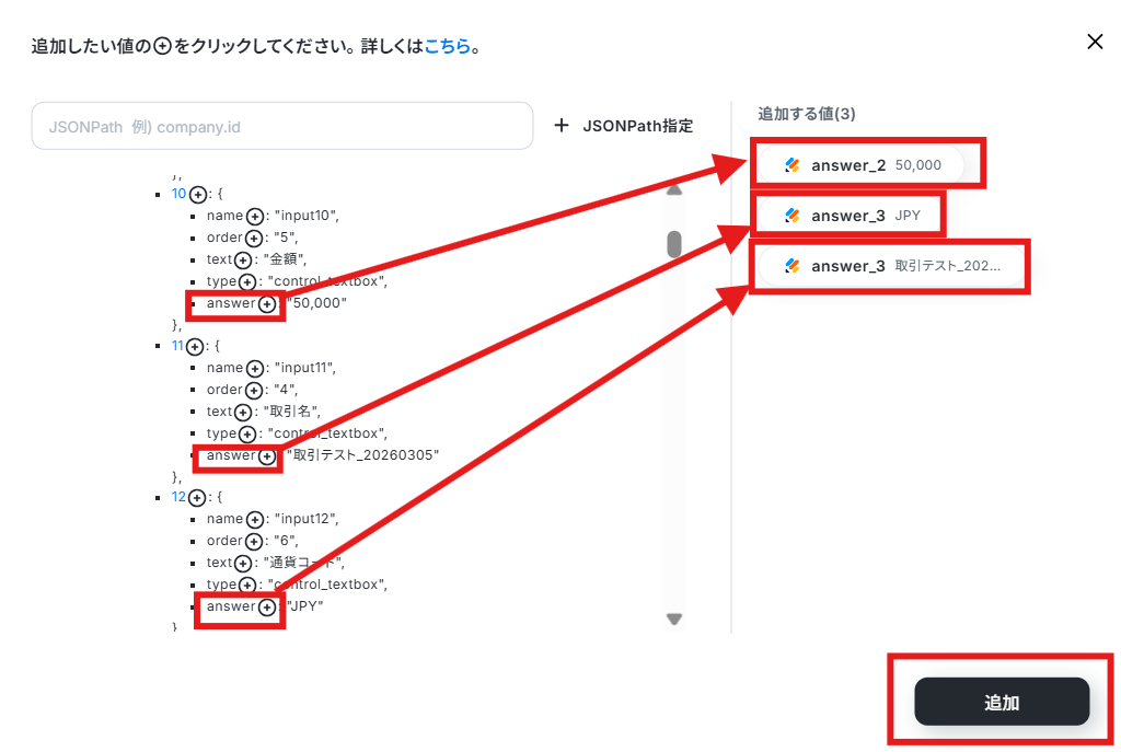 取得した値に追加したい値の「+」ボタンを押して追加ボタンを押します。