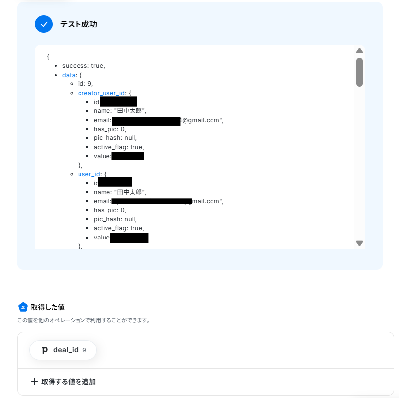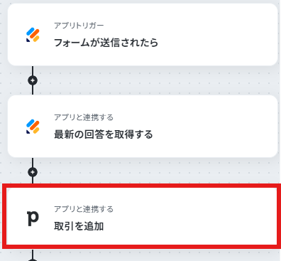 - 最後に、オペレーションでPipedriveの「取引を追加」アクションを設定し、前のステップで取得した情報をもとに取引を作成します。