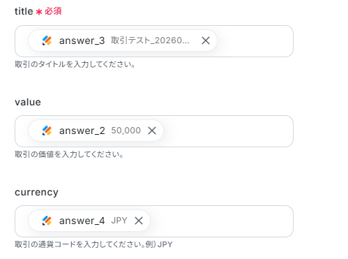 「title」「value」「currency」は前ステップで取得した値から、該当の項目に設定します。