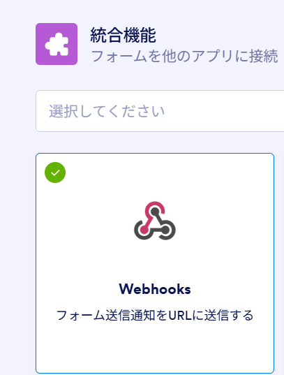該当フォームの「設定」>「連携機能」から、「Webhook」を選択すると設定が行えます。