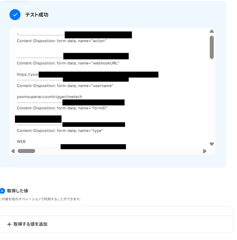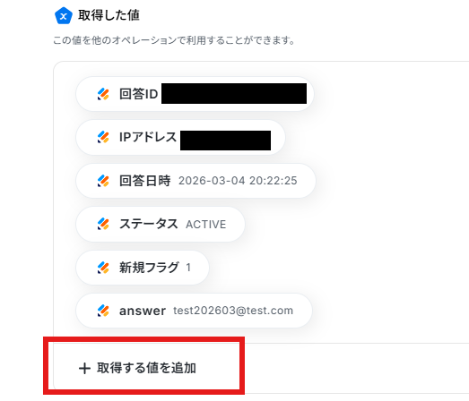 取得した値の下部にある、「+取得する値を追加」をクリックします。