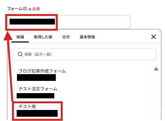 - Jotformの「最新の回答を取得する」アクションでは、連携の対象としたいフォームのIDを任意で設定してください。