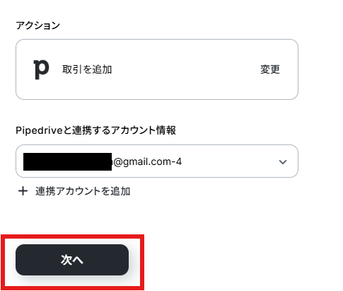 アクションはデフォルト設定のまま、アカウント情報は、連携したいアカウントが選択されているか確認してください。確認出来たら「次へ」をクリックしましょう。