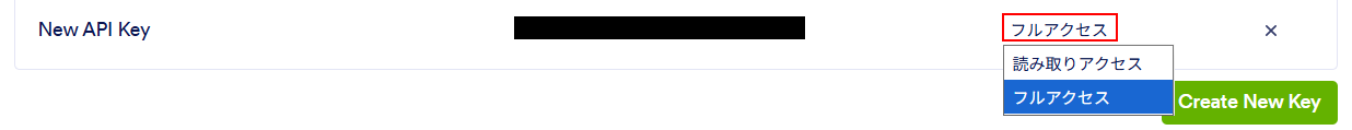右にある「読み取りアクセス」の箇所をクリックし、プルダウンメニューから「フルアクセス」を選択したら、APIキーの箇所をコピーしましょう。