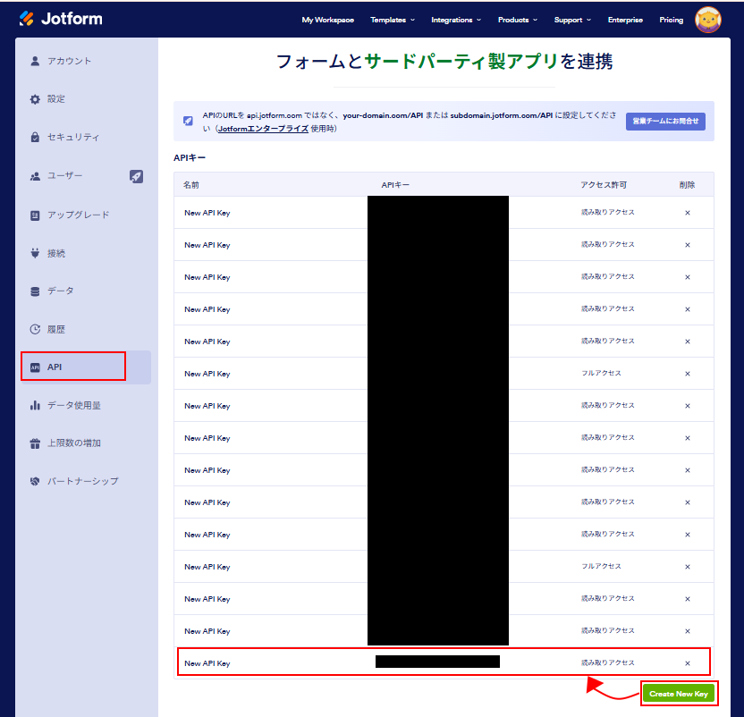 クリックすると、一番下にNew API Keyが追加されます。