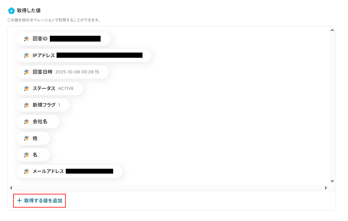 また、フォームの内容は自由に設定できる分、取得した値の中に追加したい値が表示されていない場合や、項目名は表示されていても値が表示されていない場合があります。