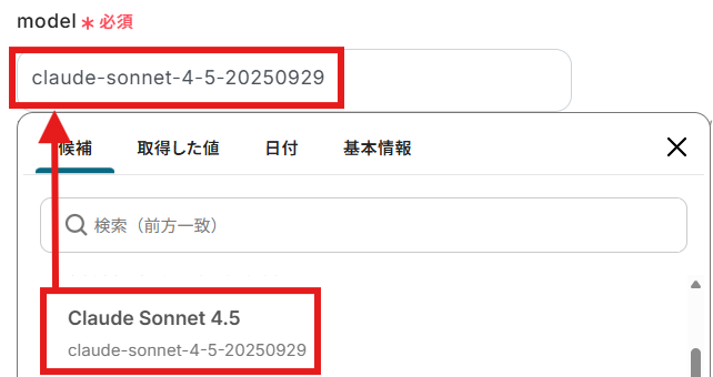 使用したいAnthropic(Claude)のモデルを候補から設定しましょう。