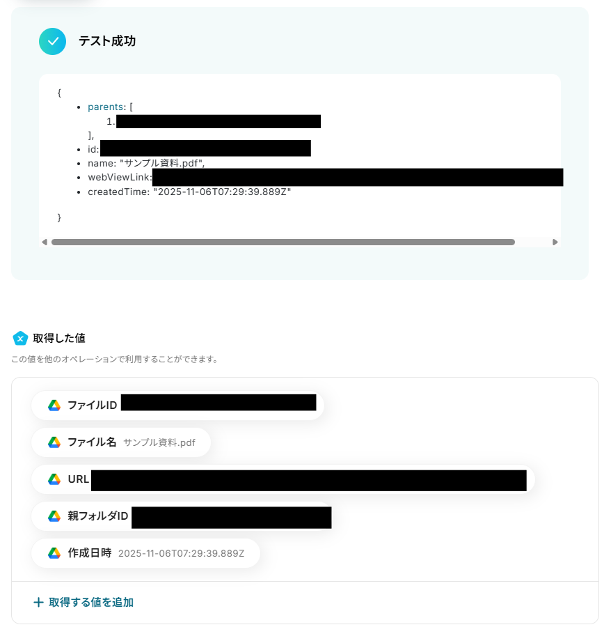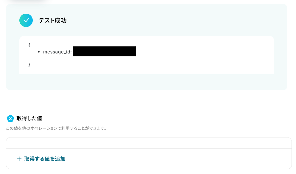 テストに成功すると「取得した値」に反映されます。詳しくは以下をご覧ください。