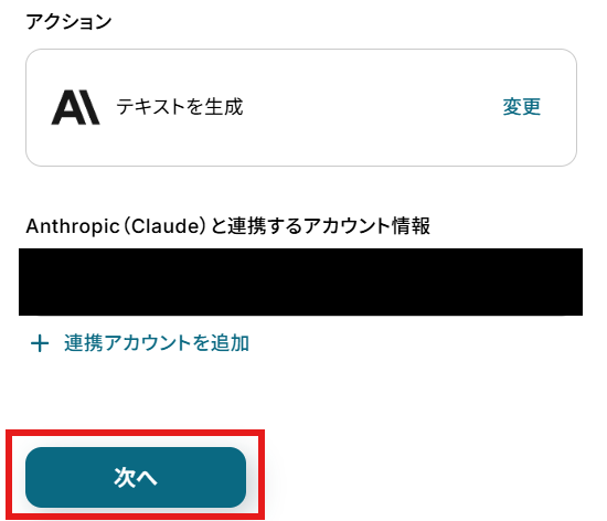 「Anthropic(Claude)と連携するアカウント情報」を確認し、「次へ」をクリックして進んでください。