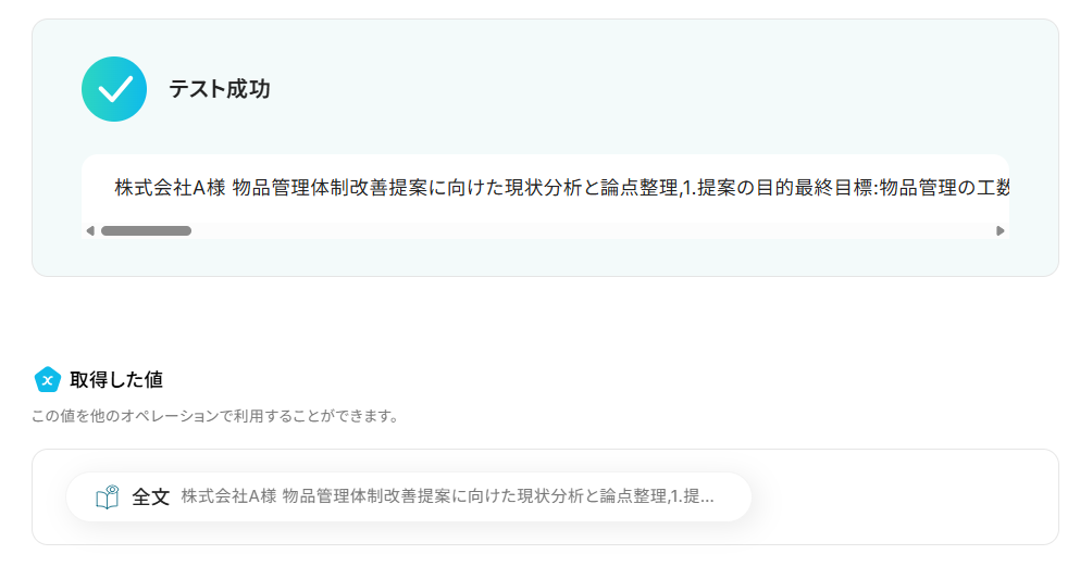 解析結果はChatworkに通知されるため、Anthropic(Claude)を活用した提案書の要約作成などを自動化し、内容の確認や共有にかかる時間を短縮します。