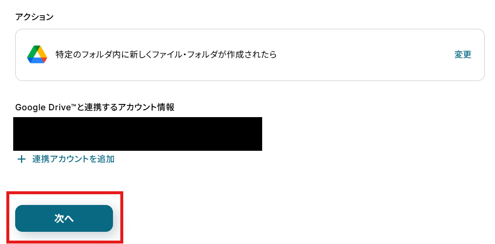 「Google Driveと連携するアカウント情報」を確認し、「次へ」をクリックして進んでください。