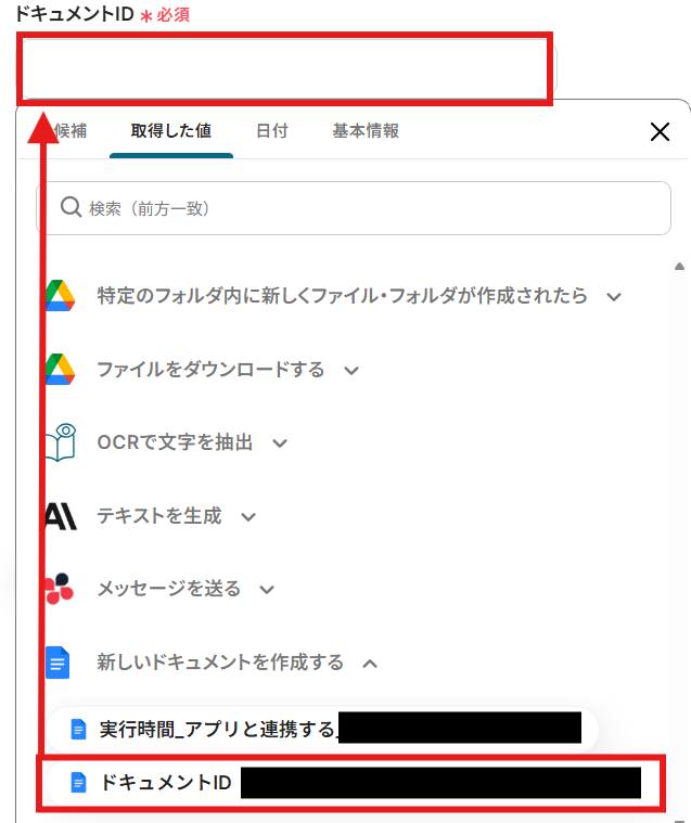 「ドキュメントID」に「新しいドキュメントを作成する」オペレーションで作成したGoogle ドキュメントを設定します。