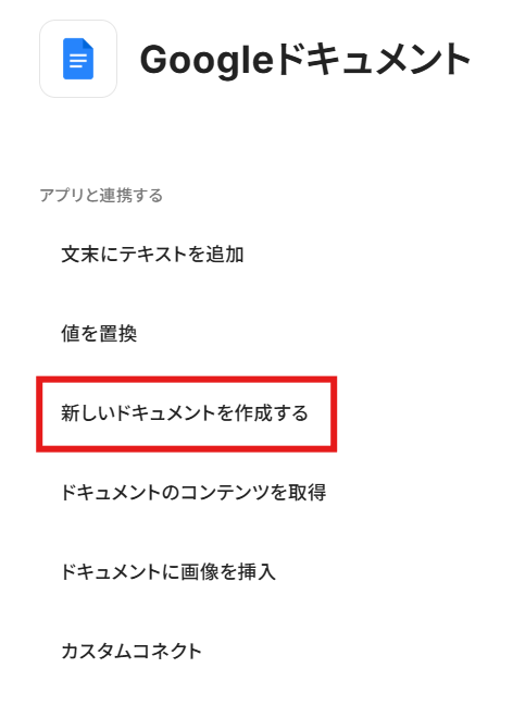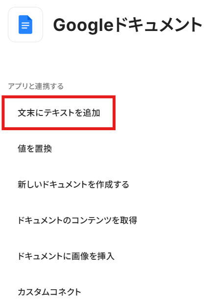 先ほどと同様にGoogle ドキュメントを検索して、「文末にテキストを追加」を選択しましょう。