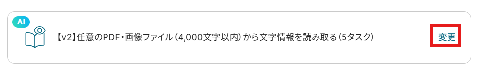 デフォルトでは「【v2】任意のPDF・画像ファイル(4,000文字以内)から文字情報を読み取る(5タスク)」が設定されていますが、「変更」から任意のアクションを選択可能です。