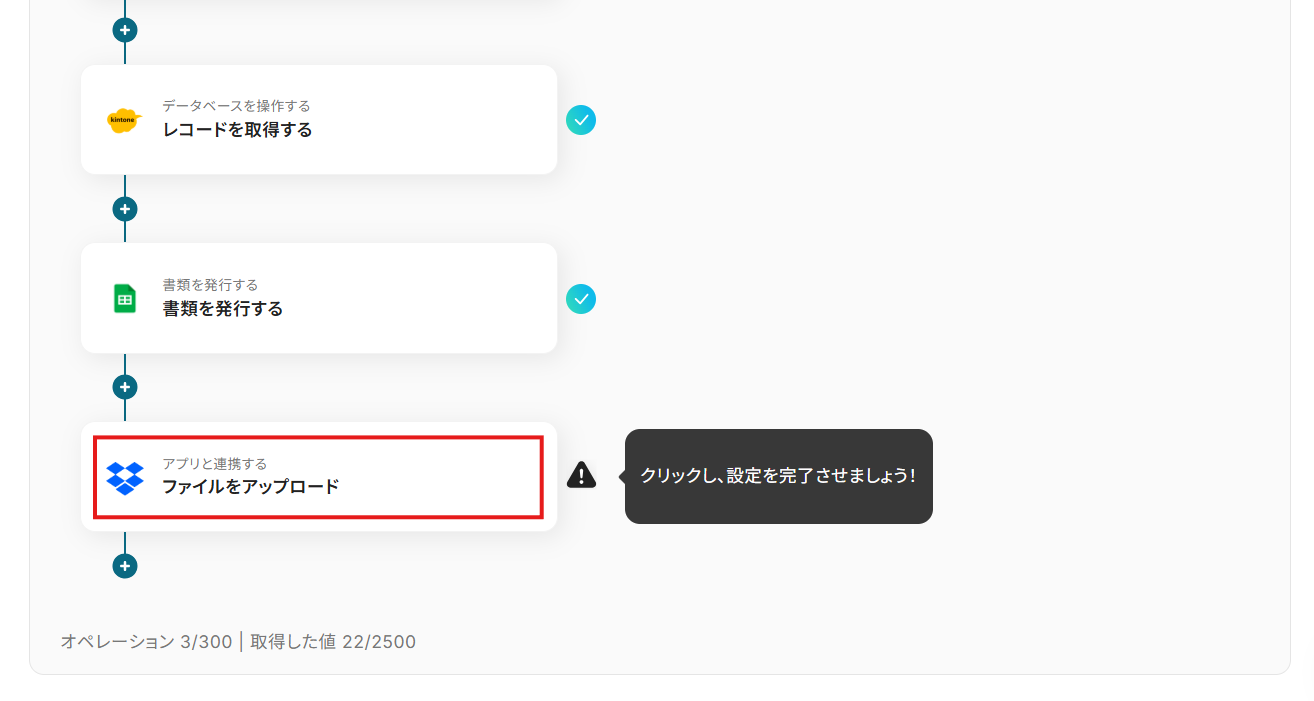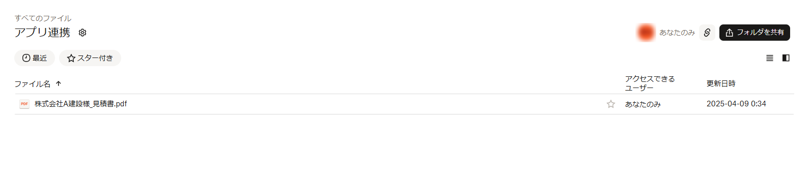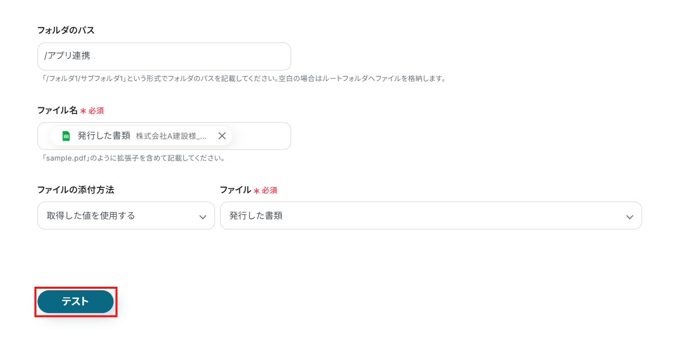 「テスト成功」の結果が表示されたら、指定した通りDropboxにレコード情報で置換されたPDFファイルがアップロードされていることを確認し、「保存する」をクリックしてください。