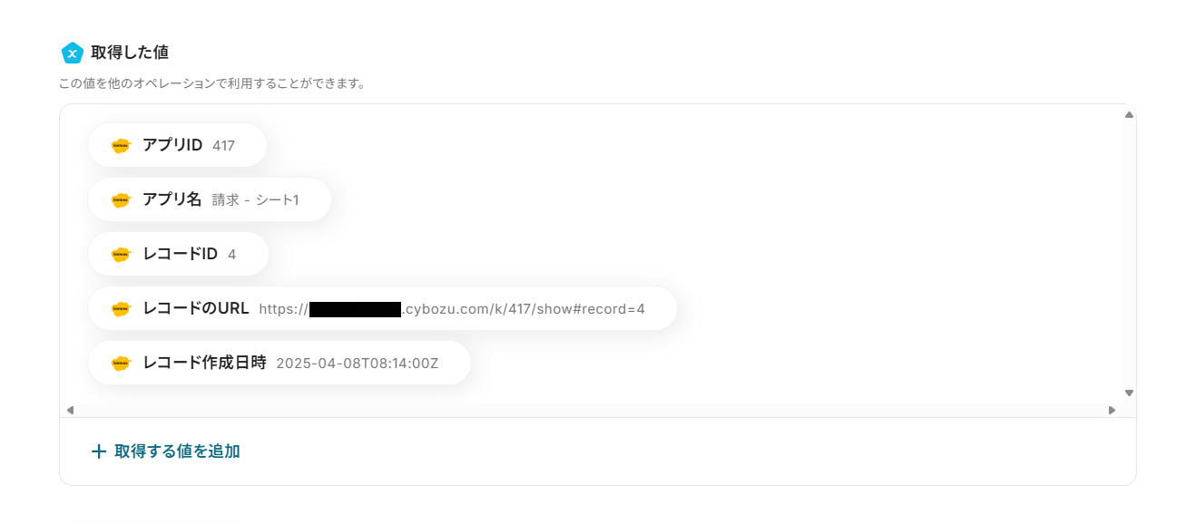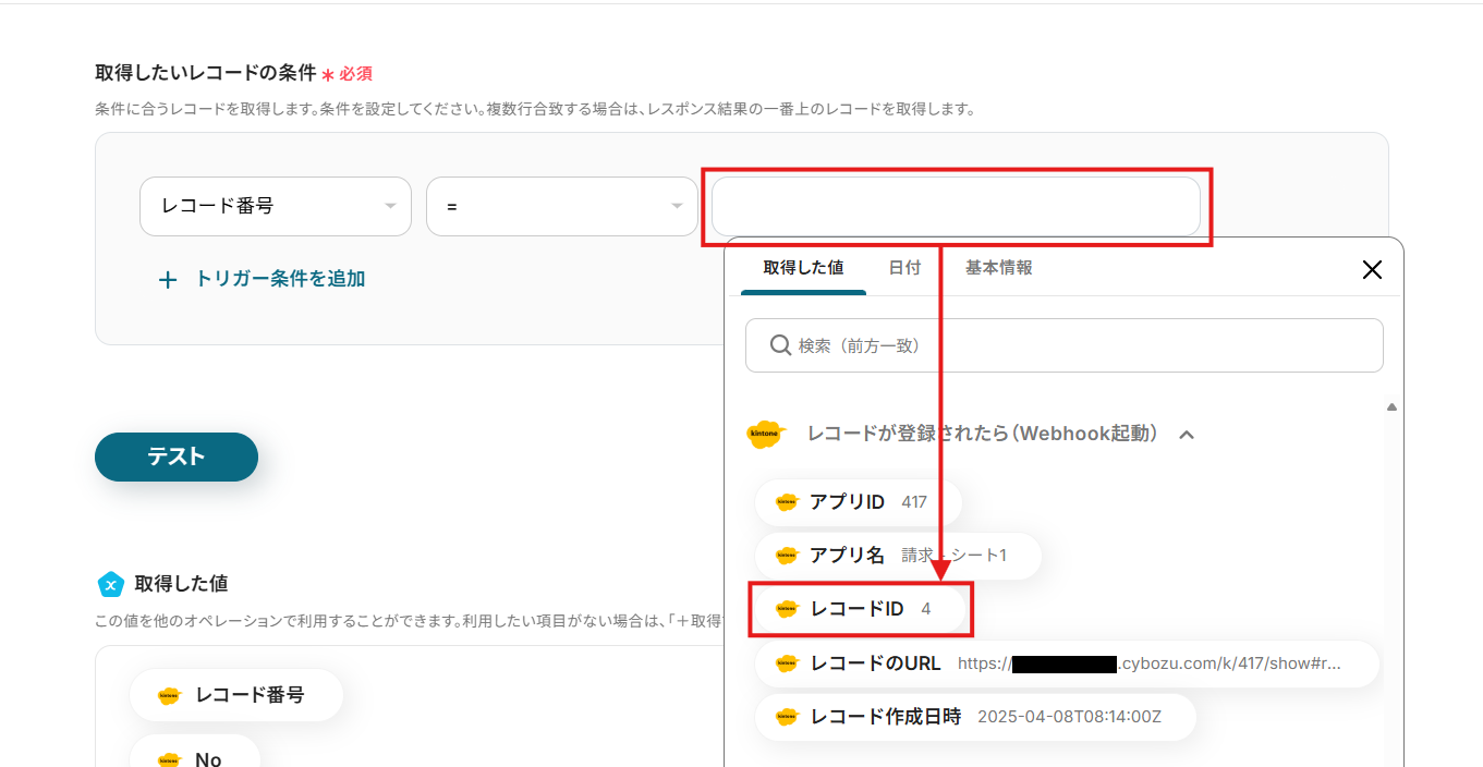 「テスト成功」の結果が表示されると、「取得した値」に登録されたレコードのID情報が追加されます。