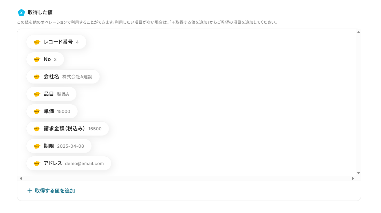 「テスト成功」の結果が表示されると、「取得した値」に指定したレコードの詳細情報が追加されます。