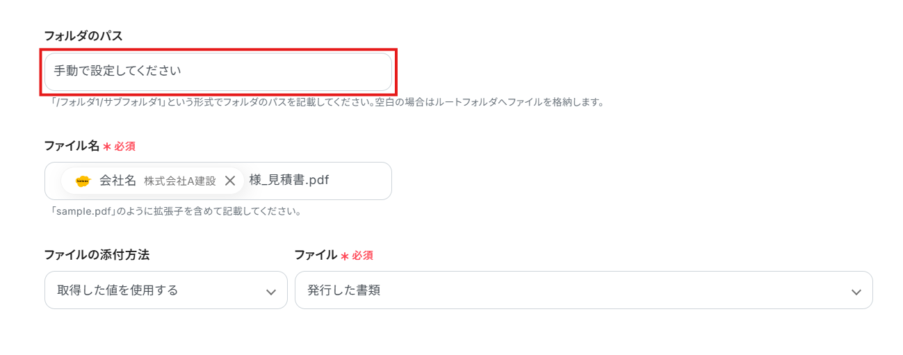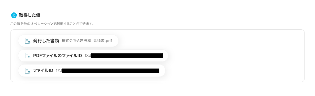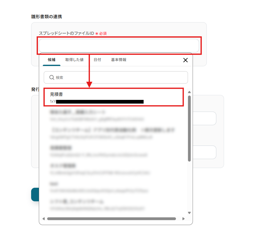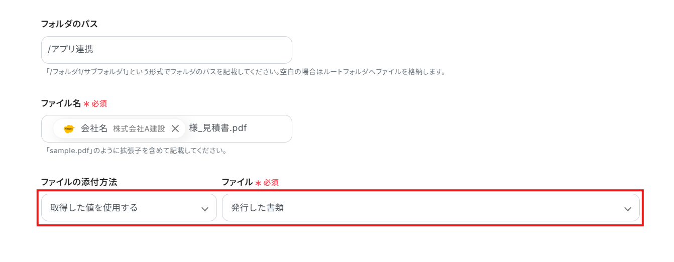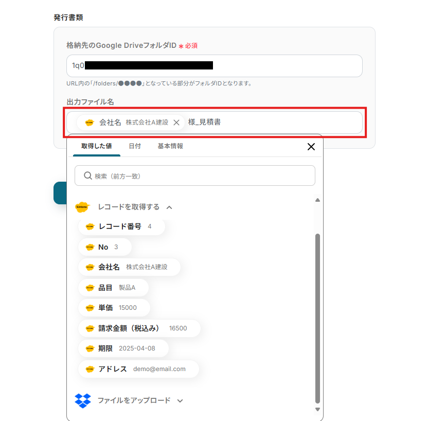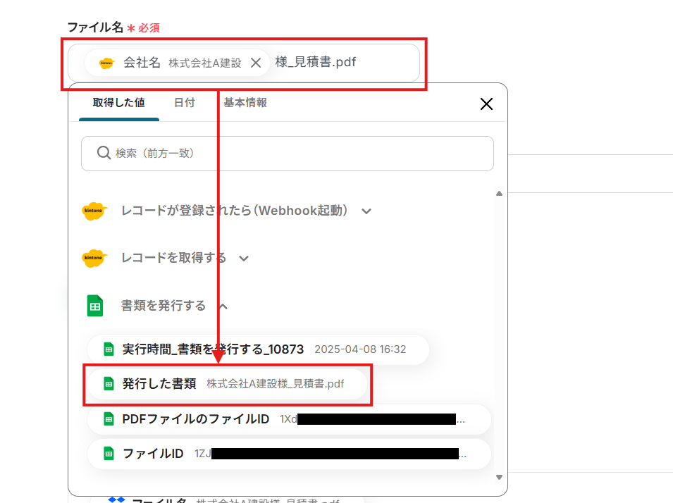 ステップ5で発行したPDFファイルと同じ名称にする場合は、入力欄クリック時に表示される「取得した値」から選択することもできます。
