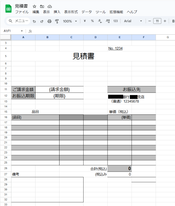 デフォルトでは下図のようなスプレッドシートを想定しており、{請求金額}、{期限}、{関連プロジェクト名}、{品目}、{単価}が置換対象の文字列となっています。